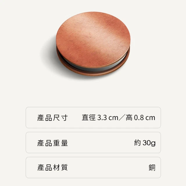 尺寸:直徑約 3.3 公分(cm),高度約 0.8 公分(cm)|重量:約 30 公克(g)|材質:銅 (因無化學塗劑防鏽,銅鏽是自然現象)|顔色:古典銅|内含符號:佛、觀音